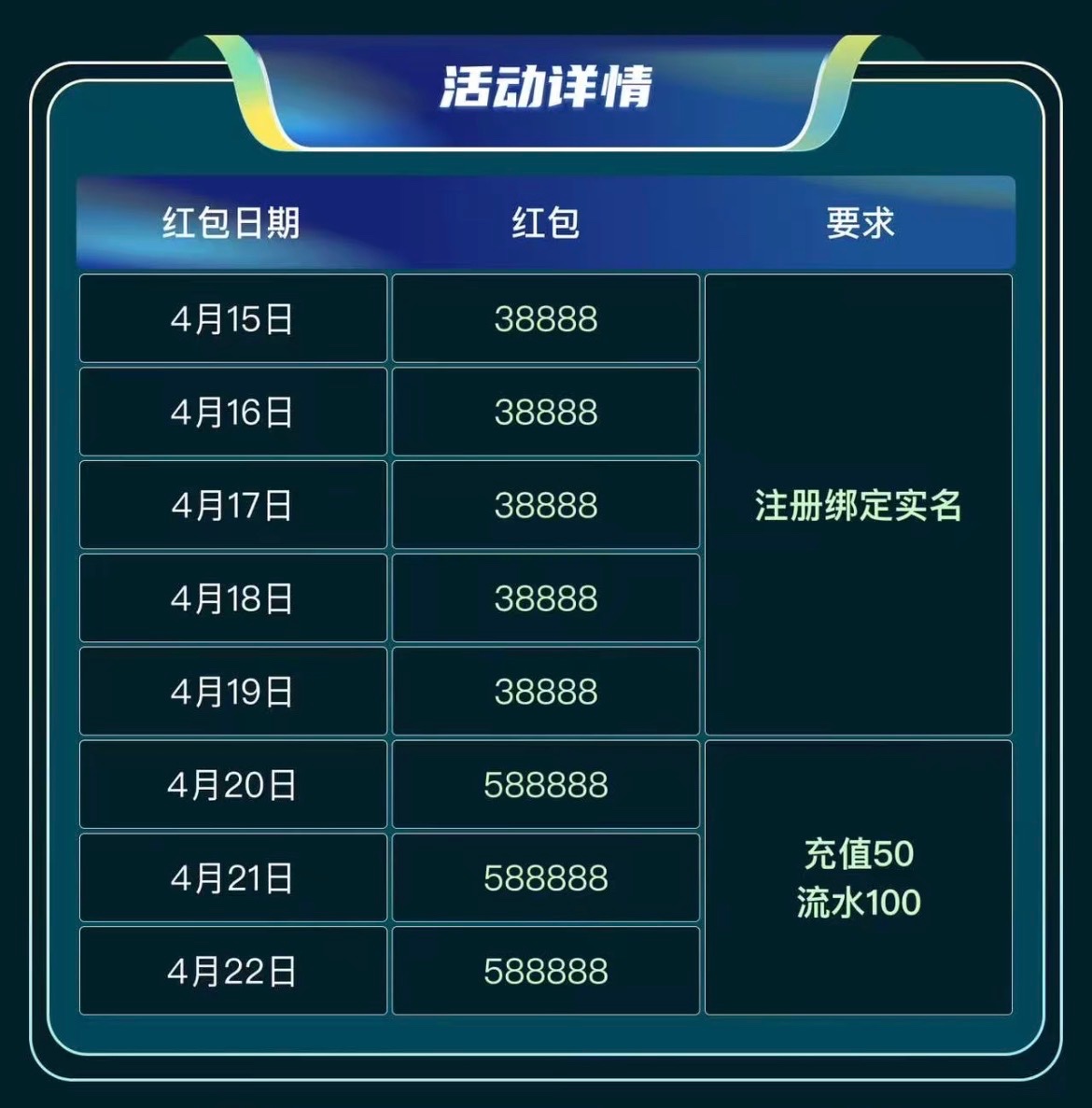 ✅开业连续3日红包雨,充值100流水300可领取