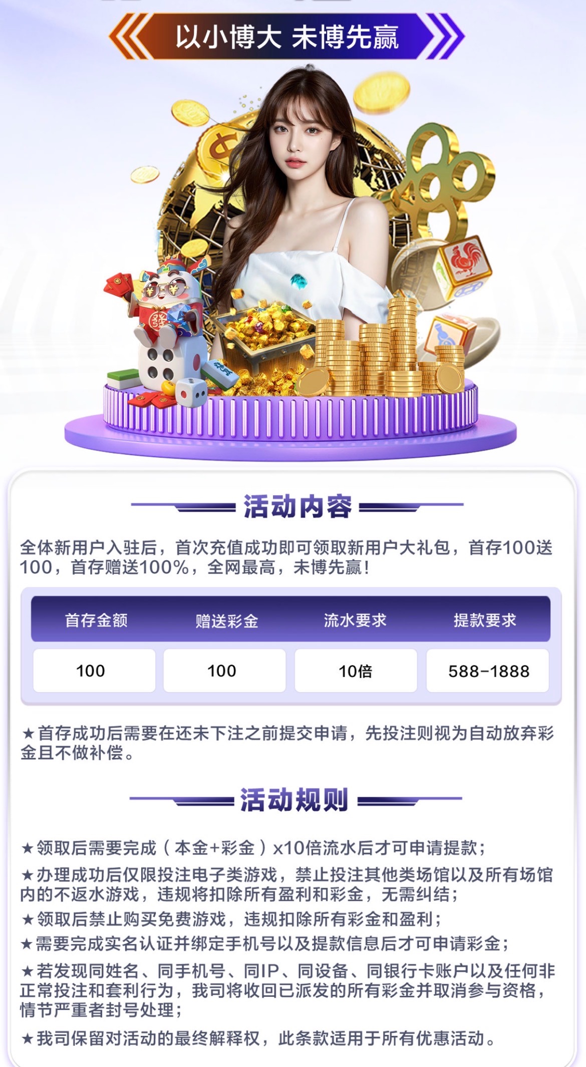 首存100+100(10倍水)最低提款588最高提款1888只能娱乐电子类游戏 娱乐其他游戏扣除盈利和彩金